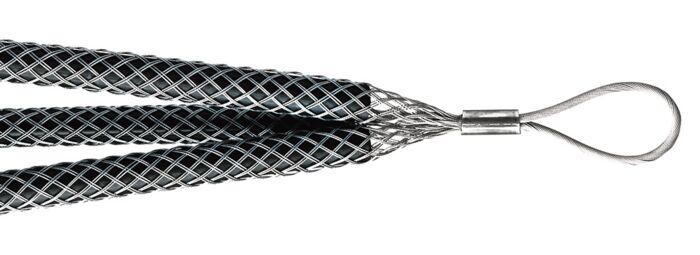 Here three insertion stockings made of galvanized steel strands are joined in a compression clamp and are fitted with a single thimble – so this triple stocking can be used to take up three cables individually (e.g. single line cables) and pulling them in a single pull without any strain on the cable.