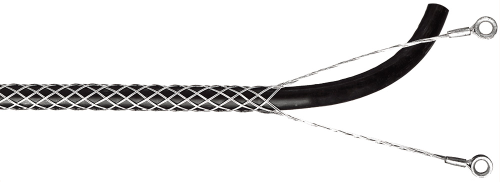 Mainly for fastening, holding and mounting as well as the strain relief of movable cables and lines on cranes, shaft and lifting devices. The advantage against conventional suspensions with clamps lies in the prevention of point stress and excluding kinking and breaking leads. These stockings are particularly suitable and in use worldwide for wind power plants, as well as in floating cranes, suspension railways and cranes. The highly dual-strand mesh made of galvanized steel and handwoven, fitted with the suspension eyelets (round thimbles), so they can be mounted at any position on the cable before installation.
